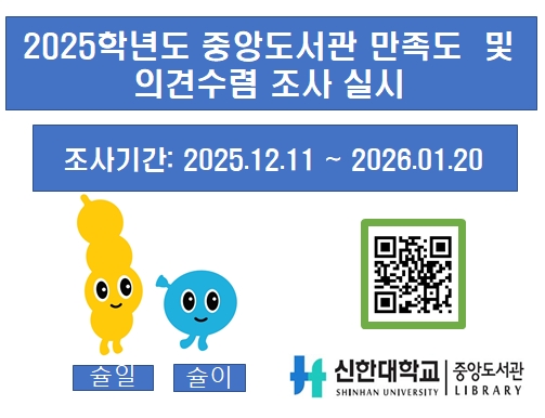 설문조사 참여 URL : https://ksurv.kr/aEM5OT09Pw * 만족도 조사에 참여하신 분은 도서 대출 안내데스크에서 소정의 기념품을 받아가시기 바랍니다. (단, 소진시까지 지급)